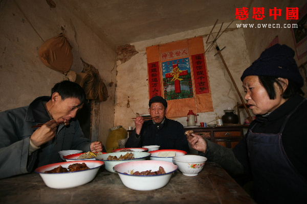 马朝宽和马术平夹起一块肉迅速吃起来,郑芙夹起一小块灌肠后有些发愣。看着举筷不动的郑芙,马朝宽安慰老伴道:“你别太难过了,今天大过年的,不要老想那些伤心的事。我们不是没有给两个儿子治病,家里再穷也还带着他们瞧病了的。找别人借钱别人也不肯借,还好有女儿愿意借钱给我们,女婿在农忙的时候也会过来帮忙。我们现在年纪大了,想多了也没用,只能是活一天算一天。如果能多活一天就让儿子多吃一天的饭,如果哪天病了我们也没办法了。你别老是哭,哭多了也改变不了什么,只会把身体哭坏了。我们俩老了,经不起折腾了,更不能生病,你说我们俩病了,谁来照顾这两个疯儿子?过年了就更不能哭了,不管怎么说我们又过了一个年,也许我们过不了几次年了。你看我们家今年也像别人家那样放了鞭炮还贴上了对联,所以高兴一点,不要像往常那样哭个不停了!”在老伴的劝慰下,郑芙忍着眼泪开始慢慢吃起来。
