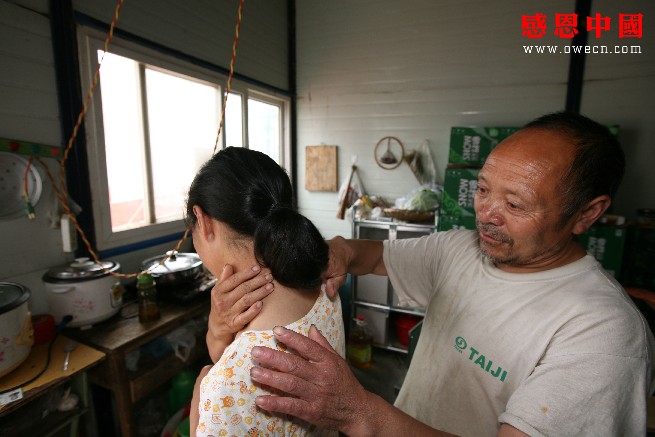 安置好啤酒,陈洪贵忙着用手轻轻地给爱人母成秀的肩膀按摩,并焦急地询问爱人:“你今天到医院看病的时候医生有没有说你的颈椎骨质增生好点了没有?给你开药了没有?是不是感觉这个地方还很痛?放心,就是我们家再穷也要把你的病看好,你可千万不要一个人扛着病痛不跟我说!”