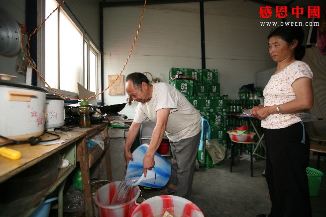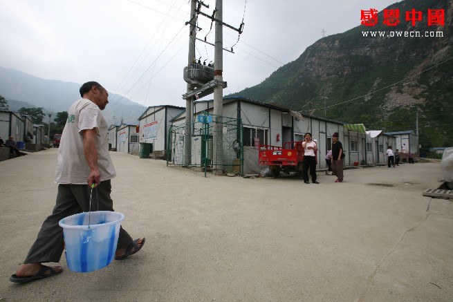 听到爱人说颈椎骨质增生没有恶化,陈洪贵才放心地提着塑料水桶到板房区的自来水房提水:“今天我们这里的道路可堵惨了!我早上进货的时候本来和我家老婆说好回来吃中午饭的,结果都3点多了我才回到家,实在没法子呀。我老婆现在颈椎骨质增生已经很严重了,我要是不赶回来提水的话,她自己提水会把她的颈椎弄的更严重的。我现在虽然腿一直痛,但是我还能干点重活,要不我们家就连提水的人都没有了!”