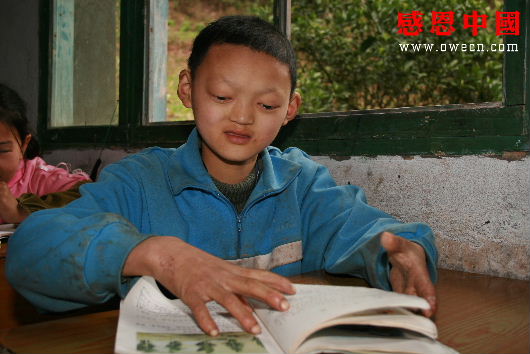 3正在教室看书的阿坤听到同学们说他是个怕热的怪小孩的时候,阿坤一直不吭声地独自默默地看着书,偶尔还从嘴角露出一丝笑容。